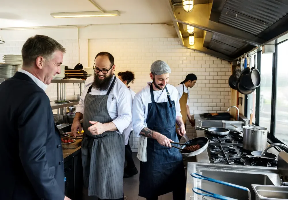 A restaurant consultant working with the kitchen staff of a restaurant.